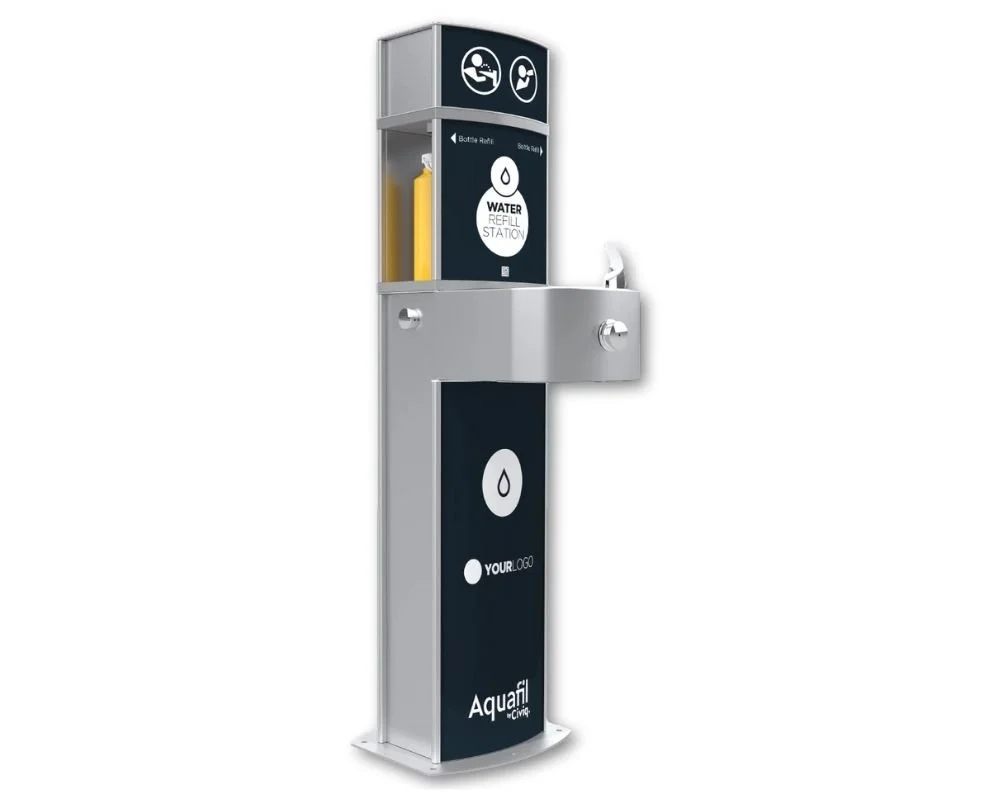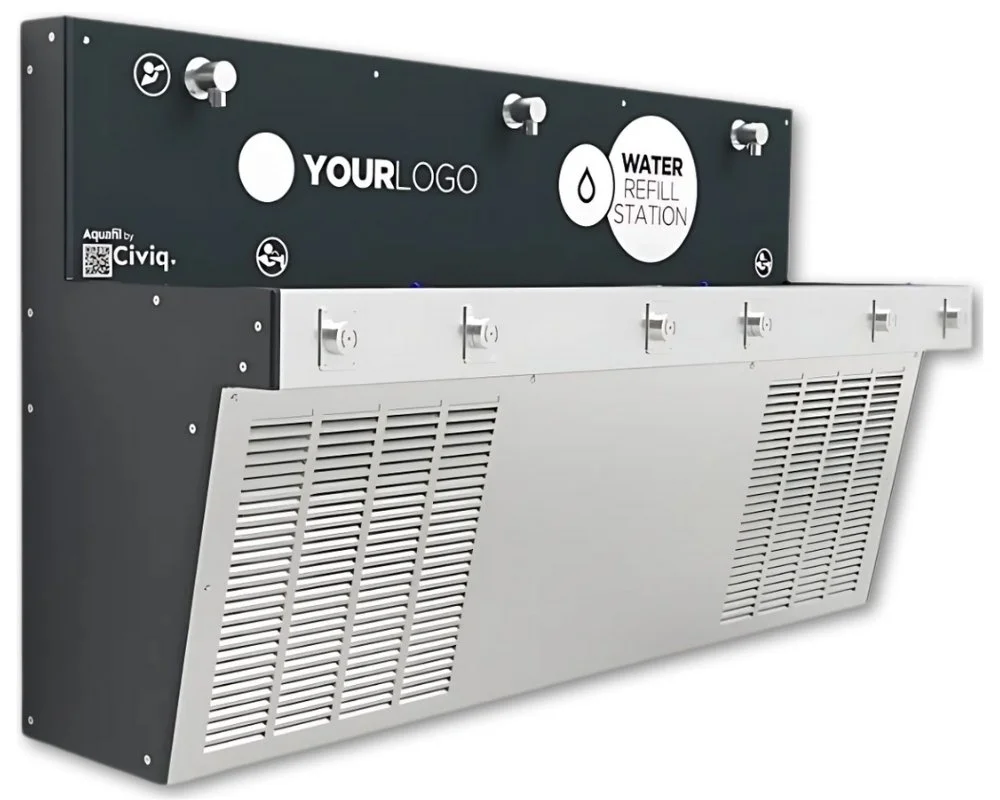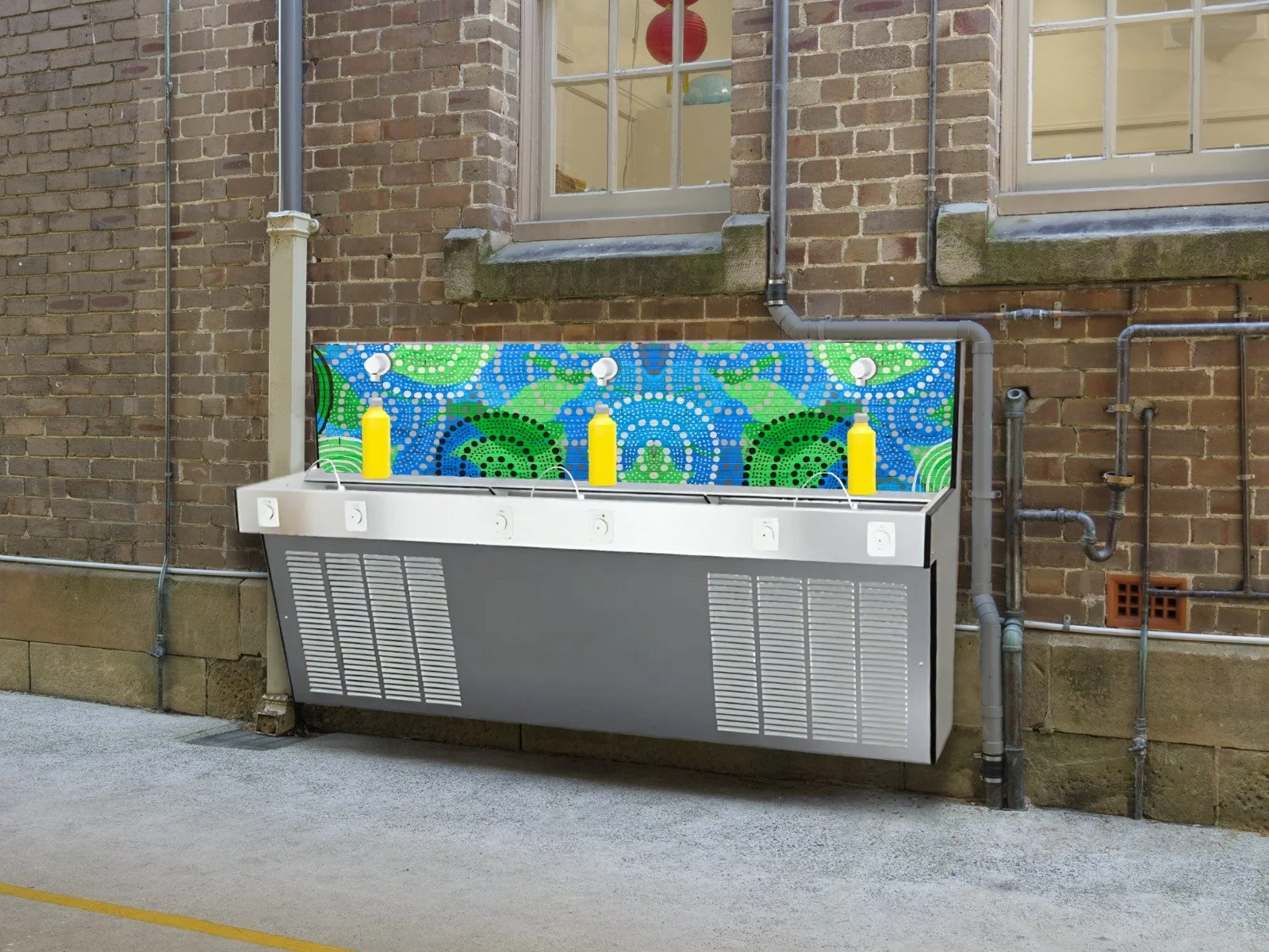 Featuring 3 bubblers and 3 water refill stations, water bottle refill shelf, stainless steel durable, chiller and incorporating our mural artwork by Zachary Bennett Brook.